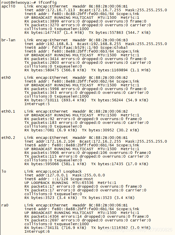 - eth0.1:虚拟设备,由VLAN划分的有线的LAN口,VLAN编号1